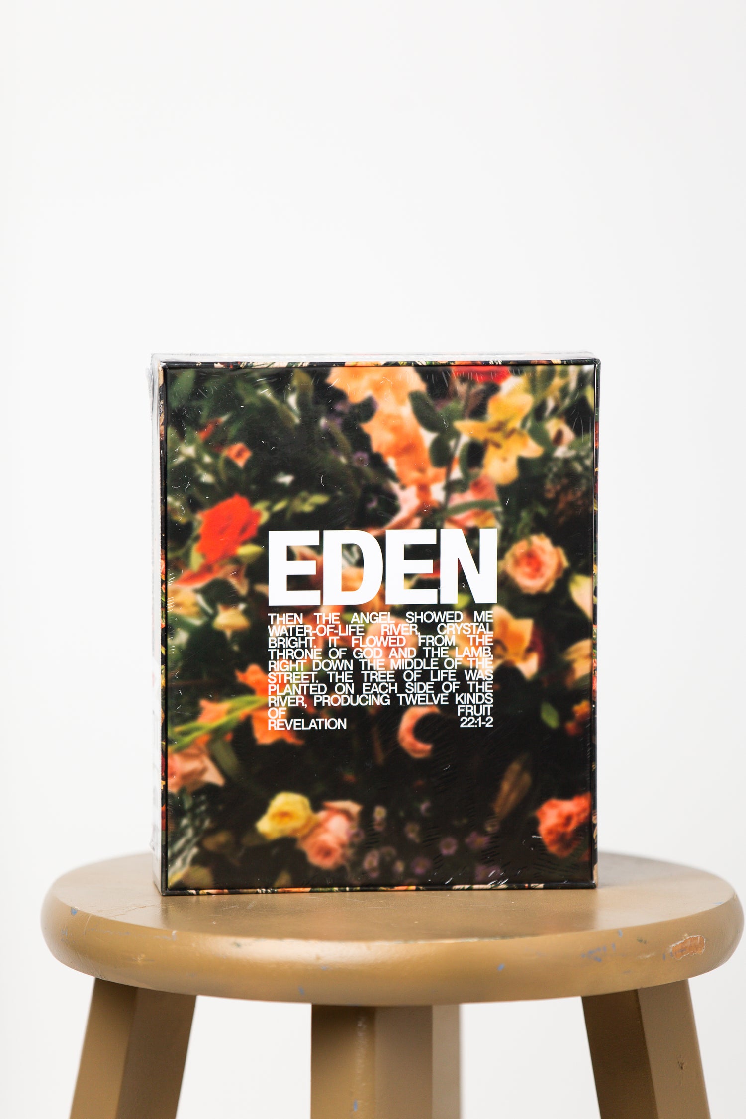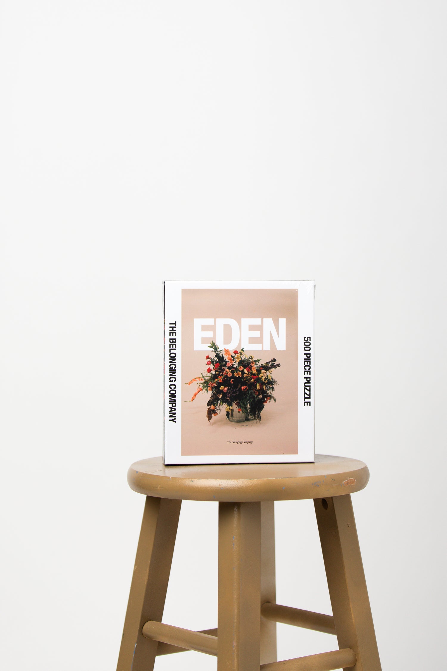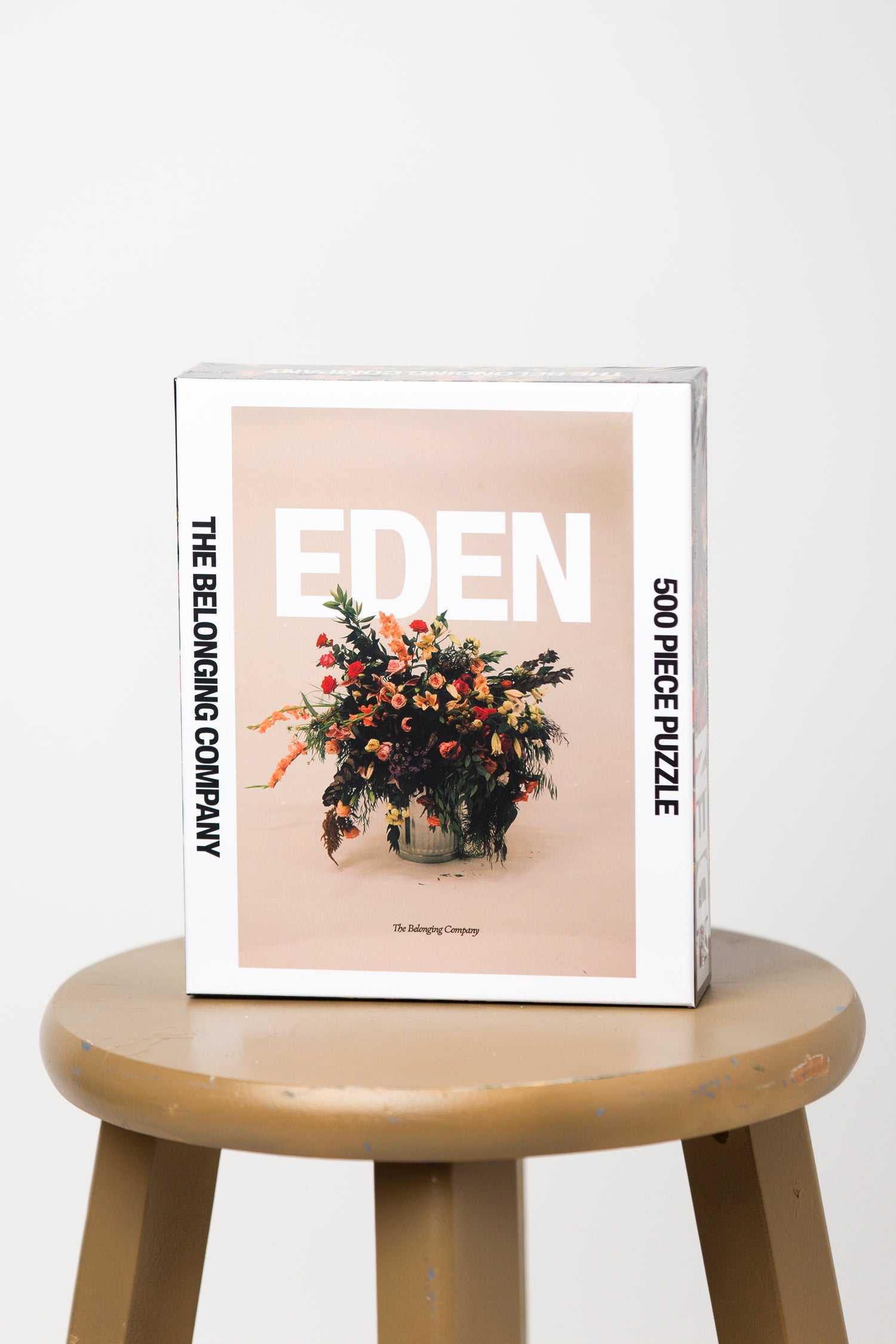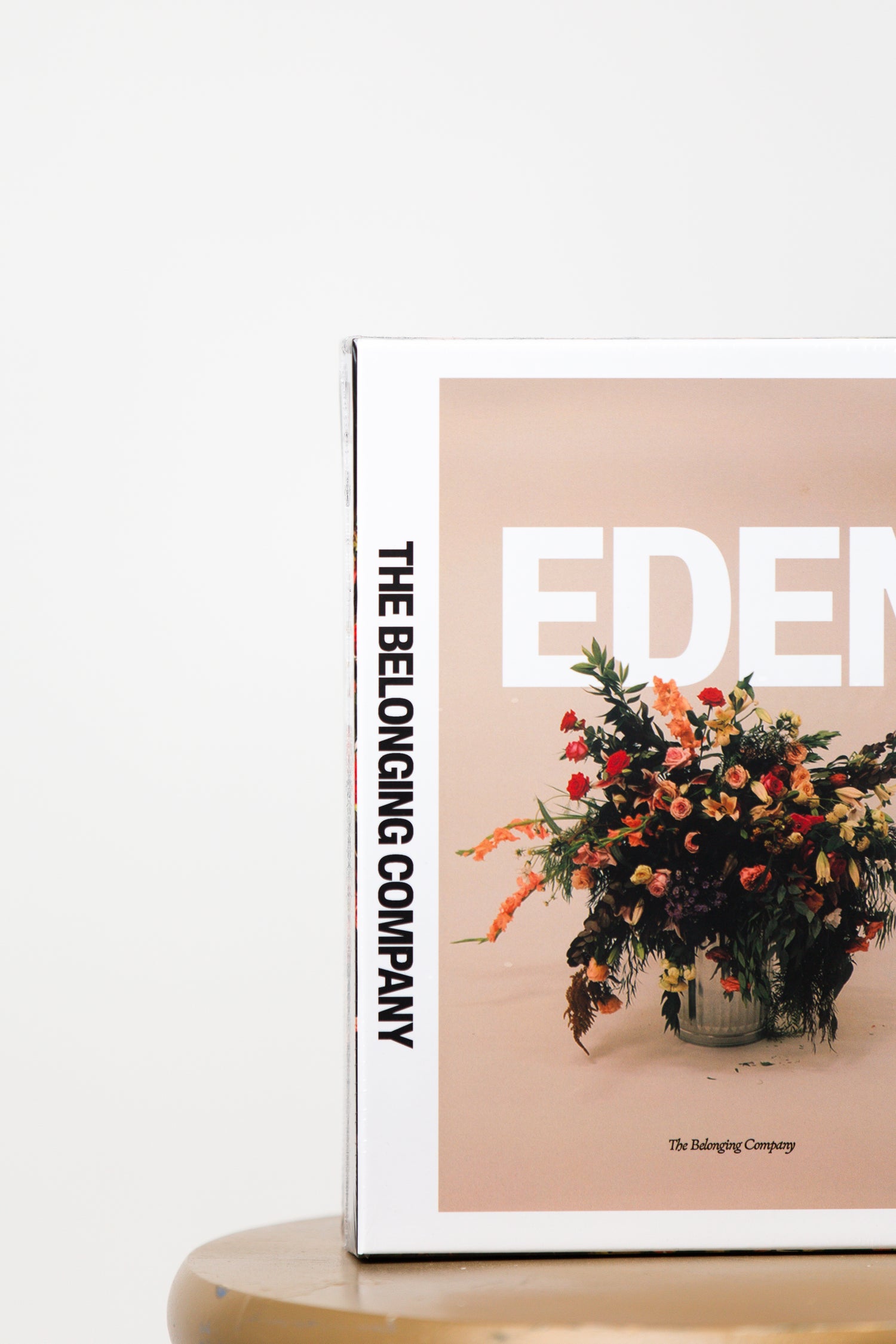 Design: Floral installation image with "EDEN" and "The Belonging Company" print.