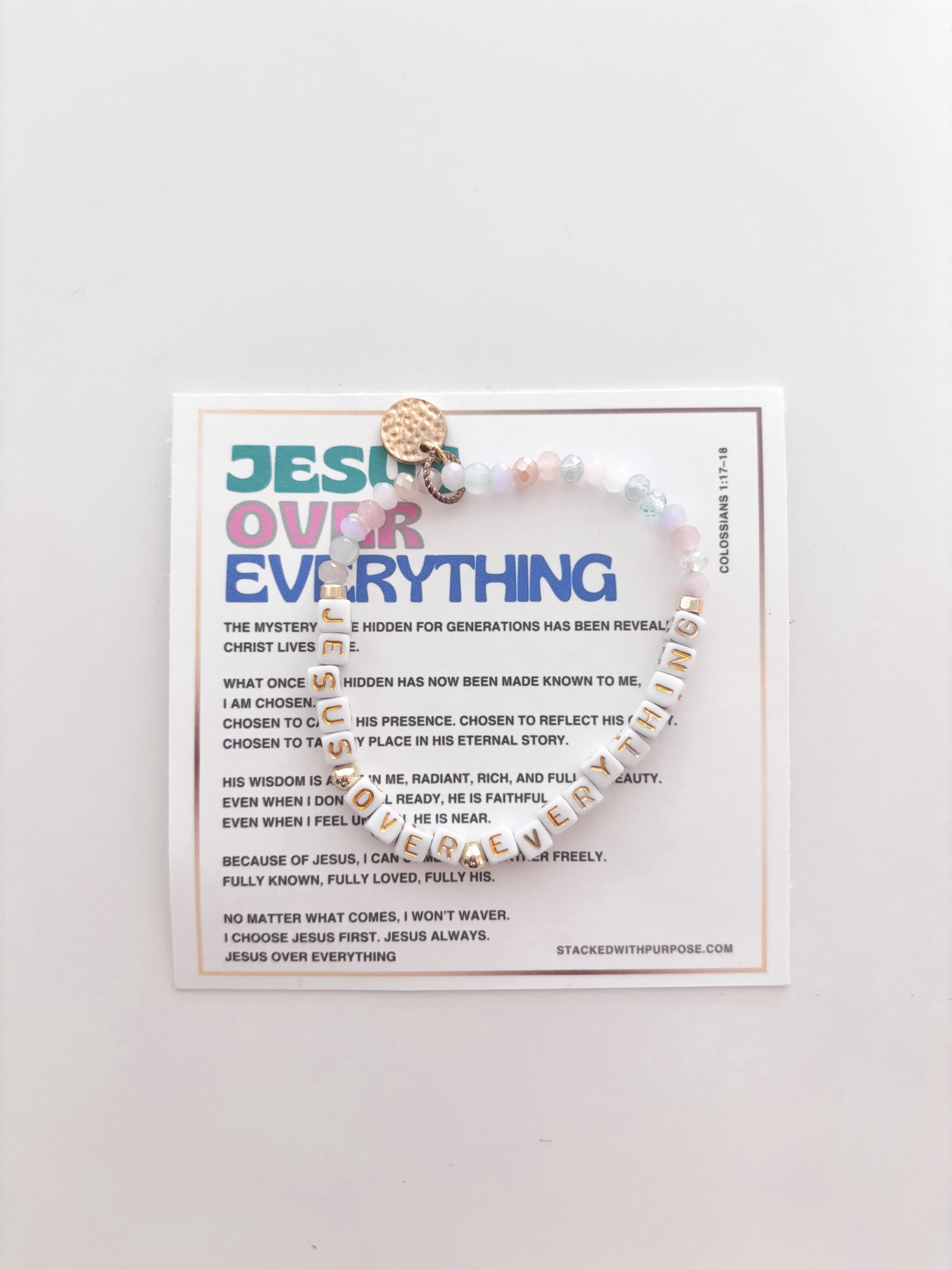 Description: Beaded charm bracelet with Jesus Over Everything wording